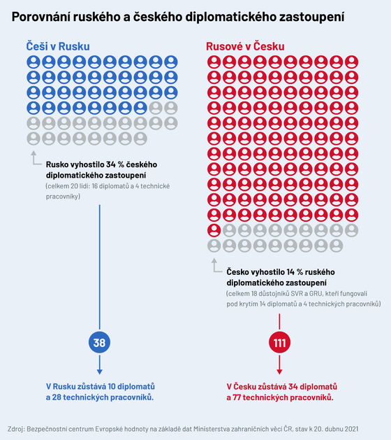 Jak loni v květnu upozornil server Hlídací pes, na ruském velvyslanectví působilo 120 lidí, z toho bylo 43 diplomatů. Včetně ruských konzulátů v Brně a Karlových Varech tu Rusko mělo 138 představitelů. Pro srovnání: v USA se jich pohybuje kolem osmdesáti. Po zásahu Černínského paláce kvůli ruském podílu na výbuchu ve Vrběticích se nyní v Česku zdržuje 111 zástupců Ruska. V Praze zůstalo 27 diplomatů (dalších sedm jich je na konzulátech v Brně a Karlových Varech).